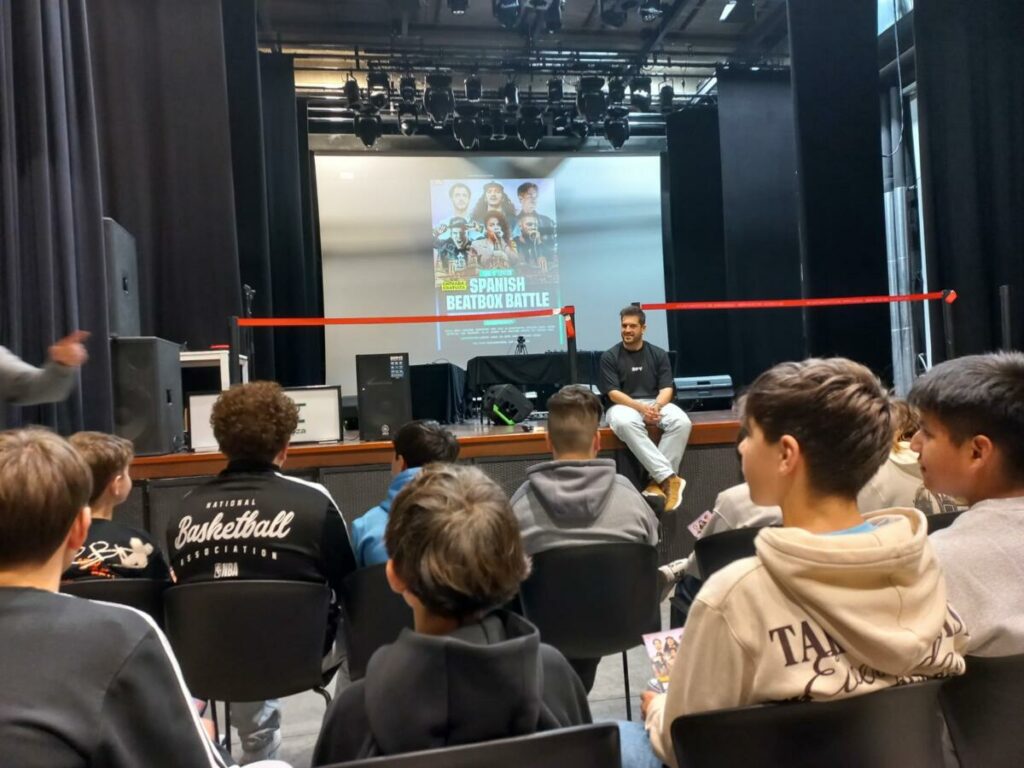 Además, hemos sido afortunados de poder experimentar en pequeños grupos con la máquina de loopstation, amplis y micrófonos, y componer siguiendo las instrucciones del formador. Boris Bringas, Orodreth, nos iba indicando la secuencia para articular sonidos, grabarlos en una pista, accionar el bucle (lo que exigía una gran coordinación entre manos y voz para ajustarlo al instante correcto) y después combinar las diferentes pistas y efectos y lograr una base para el canto del rapero. Iniciarse en esta disciplina, fundamentalmente autodidacta a través de tutoriales, experimentación y práctica, de la mano de un campeón nacional, hace que hayamos perdido el vértigo para lanzarnos una y otra vez en las múltiples posibilidades que se nos brindan. Además, nos ha animado a asistir al campeonato nacional, la Spanish Beatbox Battle, que tendrá lugar en este mismo marco el próximo sábado 24.